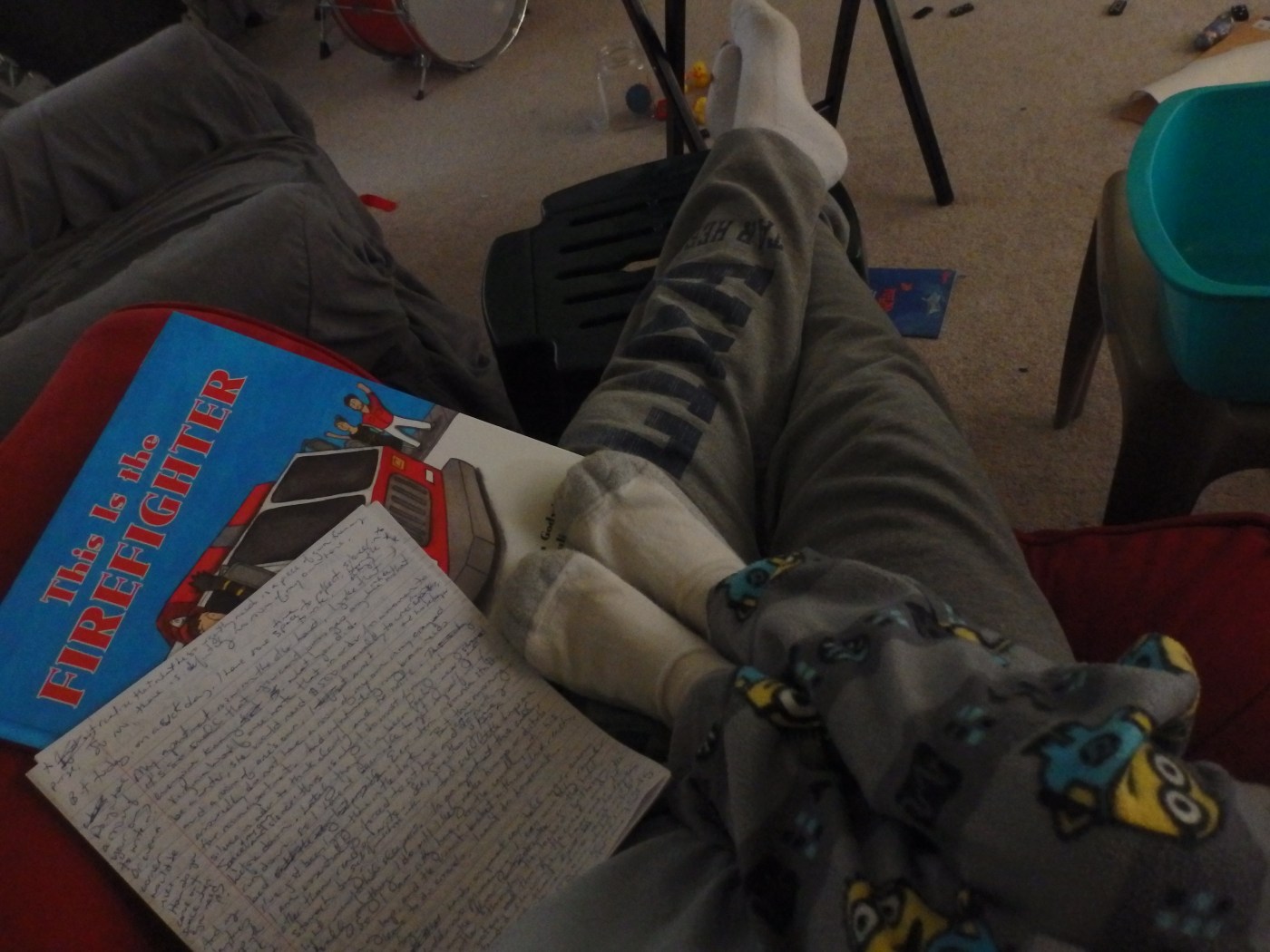 But this morning, I am stuck here being quiet and still. Sweetboy is home sick from school with the stomach bug that’s been going around. And sick little boys are restless sleepers. In an apartment this small, most anything I do will likely wake him up. And he begged me to stay close. So I am sitting here, on the couch, with Sweetboy’s feet in my lap, and the vomit bucket within close reach, with my writing paper leaning on a large hardcover picture book called This Is The Firefighter. I can’t leave to do errands. I can’t do noisy housework. I’m rubbing his feet, keeping puke off the couch, and writing. It is a fitting portrait of a stay-at-home-mom who wants to be a stay-at-home-mom-who-writes. I’ll make do without a room of my own. Like now, holed up in my apartment for a sick day, I have found an unexpected tiny pocket of silence in which to write while sharing my space with some little feet.